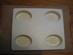After 24-48 hours remove from molds. Cut and trim into whatever size bars you desire. Now is the time to stamp if you want to add that decorative touch. Place soap bars on a screen to cure for 4-6 weeks. Cover lightly with cloth to protect. If using plastic molds you may need to place in the freezer for a short period of time in order to get the soap to release cleanly. This will not damage the soap in any way. I have used this technique many times for molded soap or candles.