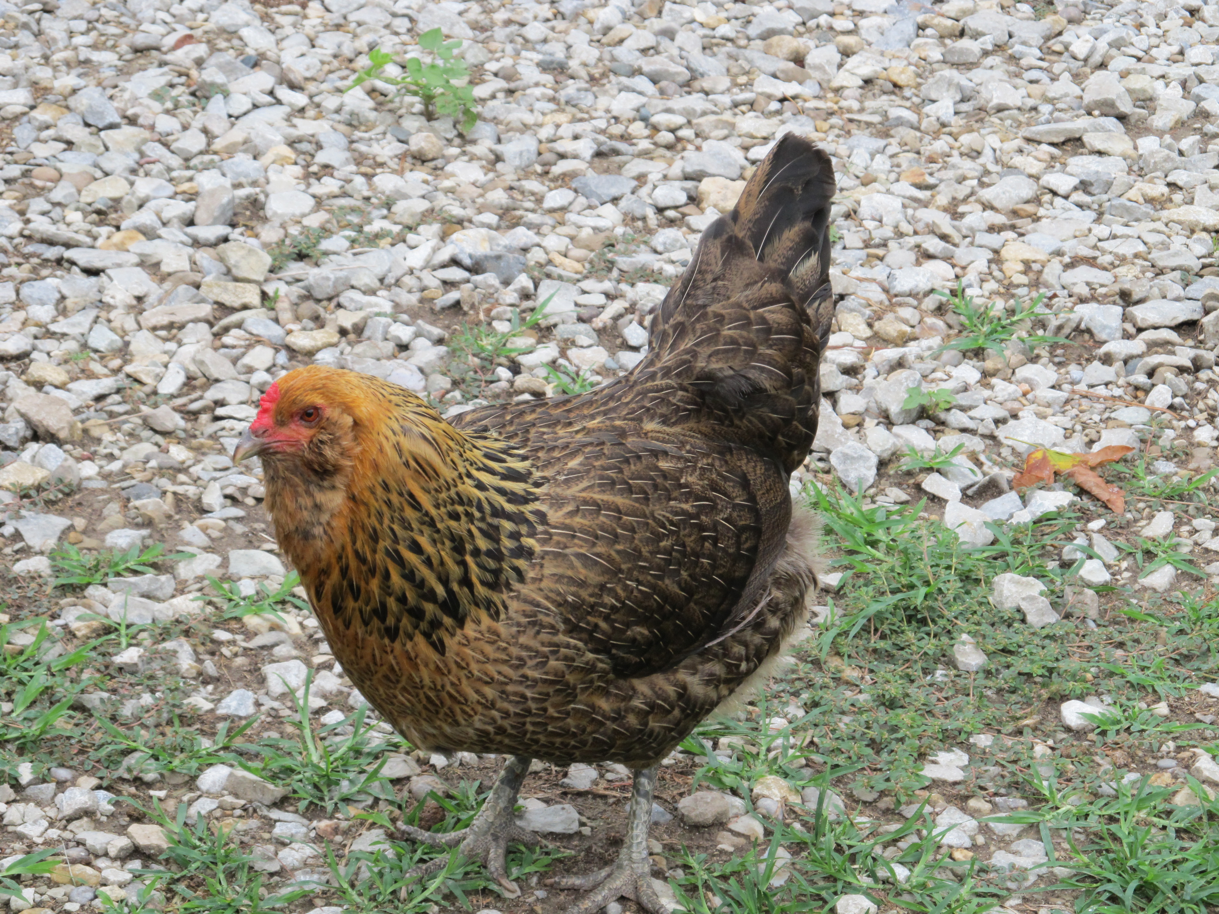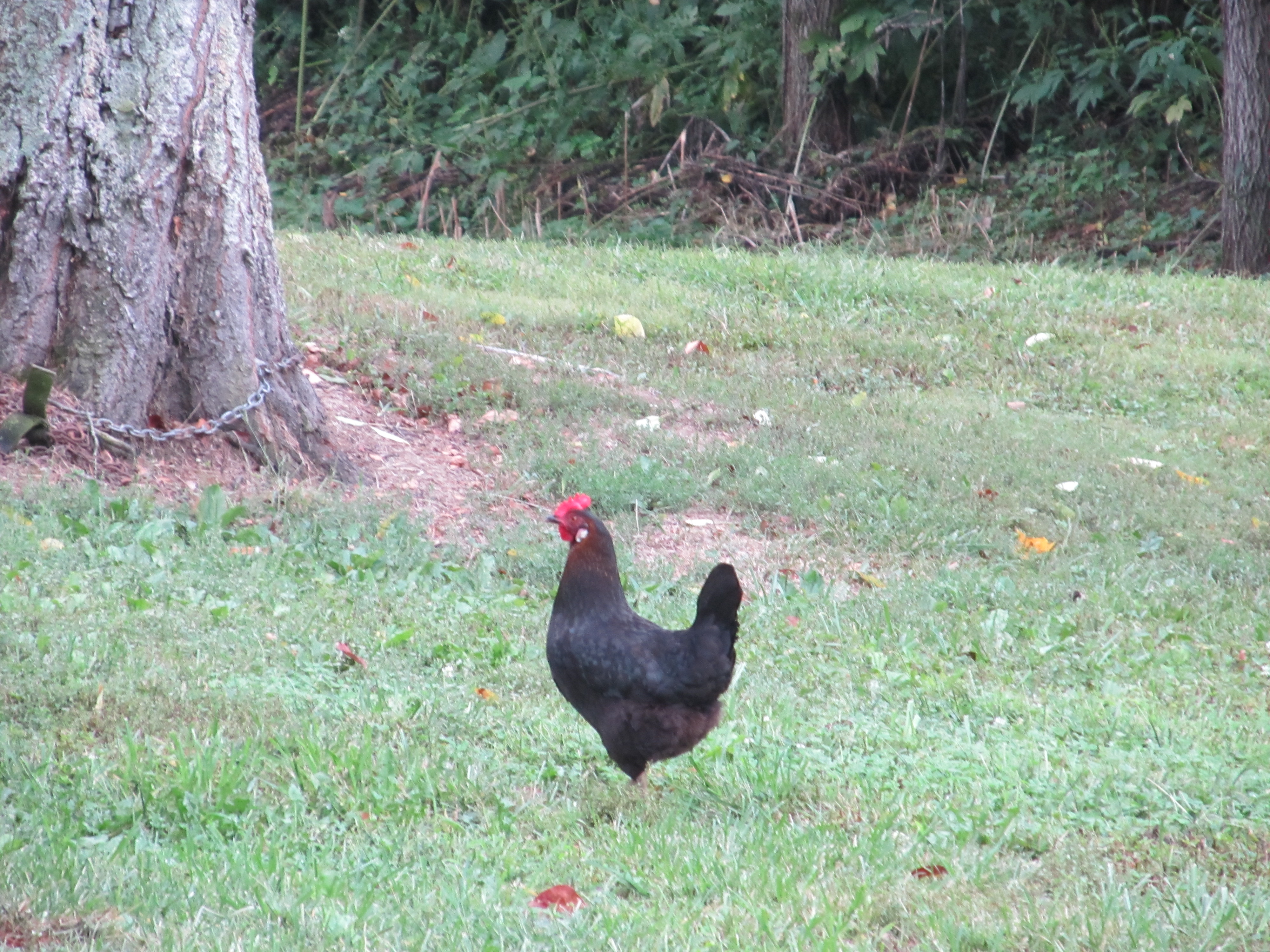 Black Sex-link grazing the yard one afternoon.