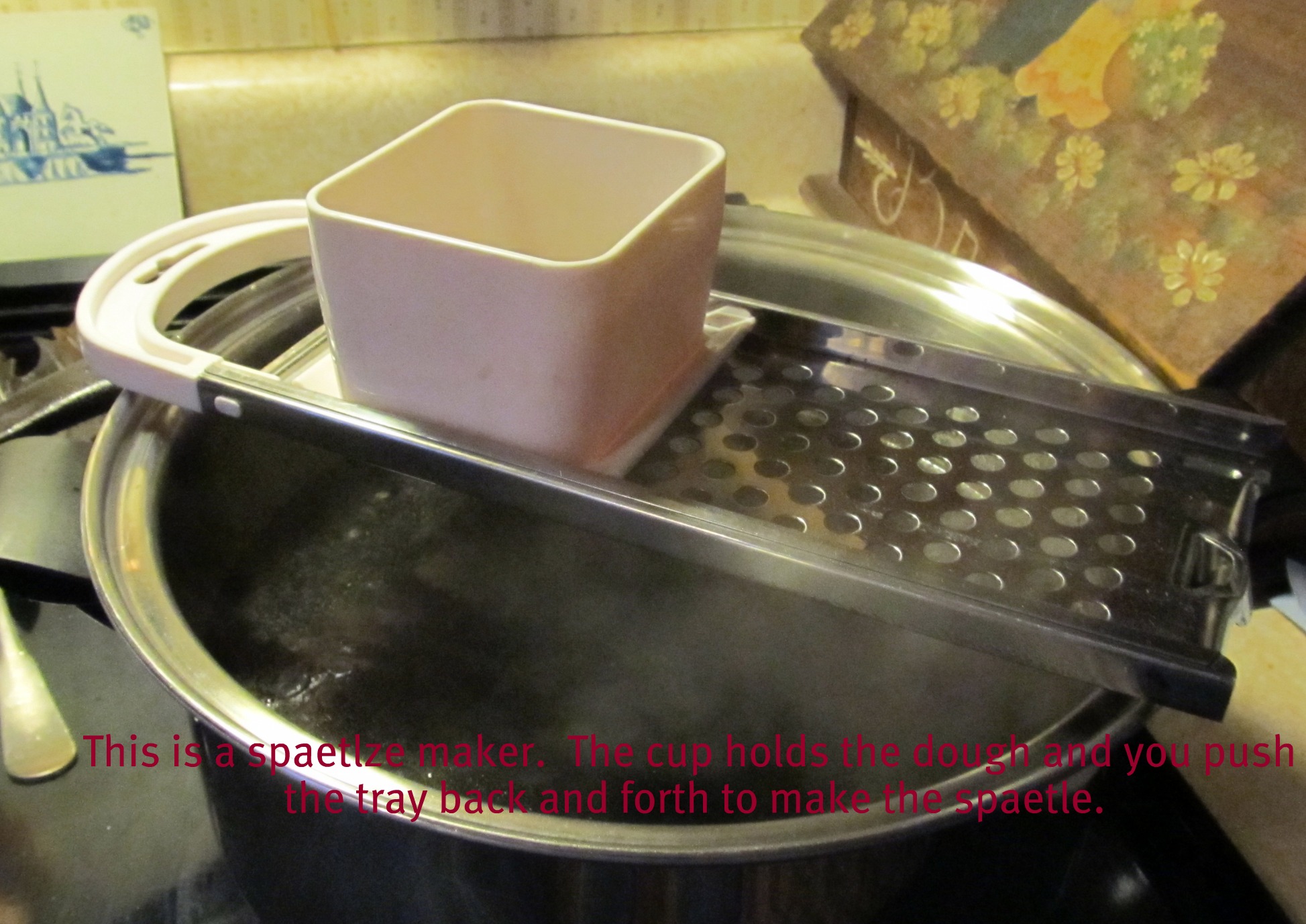 I’d like to share a recipe for Spaetzle (pronounced spehtzl), a German soft noodle that takes only minutes to make. You will need to purchase a spaetzle maker as seen below. I tried everything in my kitchen to make it without the device and was sorely frustrated! Purchase price begins around $10 dollars for a maker like the one shown below. They are worth every penny if you like to make and eat spaetzle!