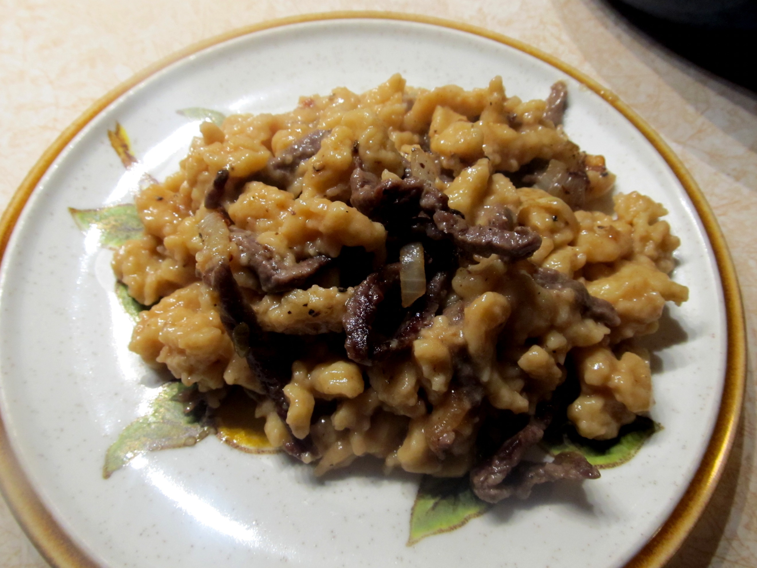 Tonight I sauteed some onions and thinly sliced beef steak until tender, seasoned to taste and mixed with the spaetzle to make a delicious quick supper. This is comfort at it’s best!