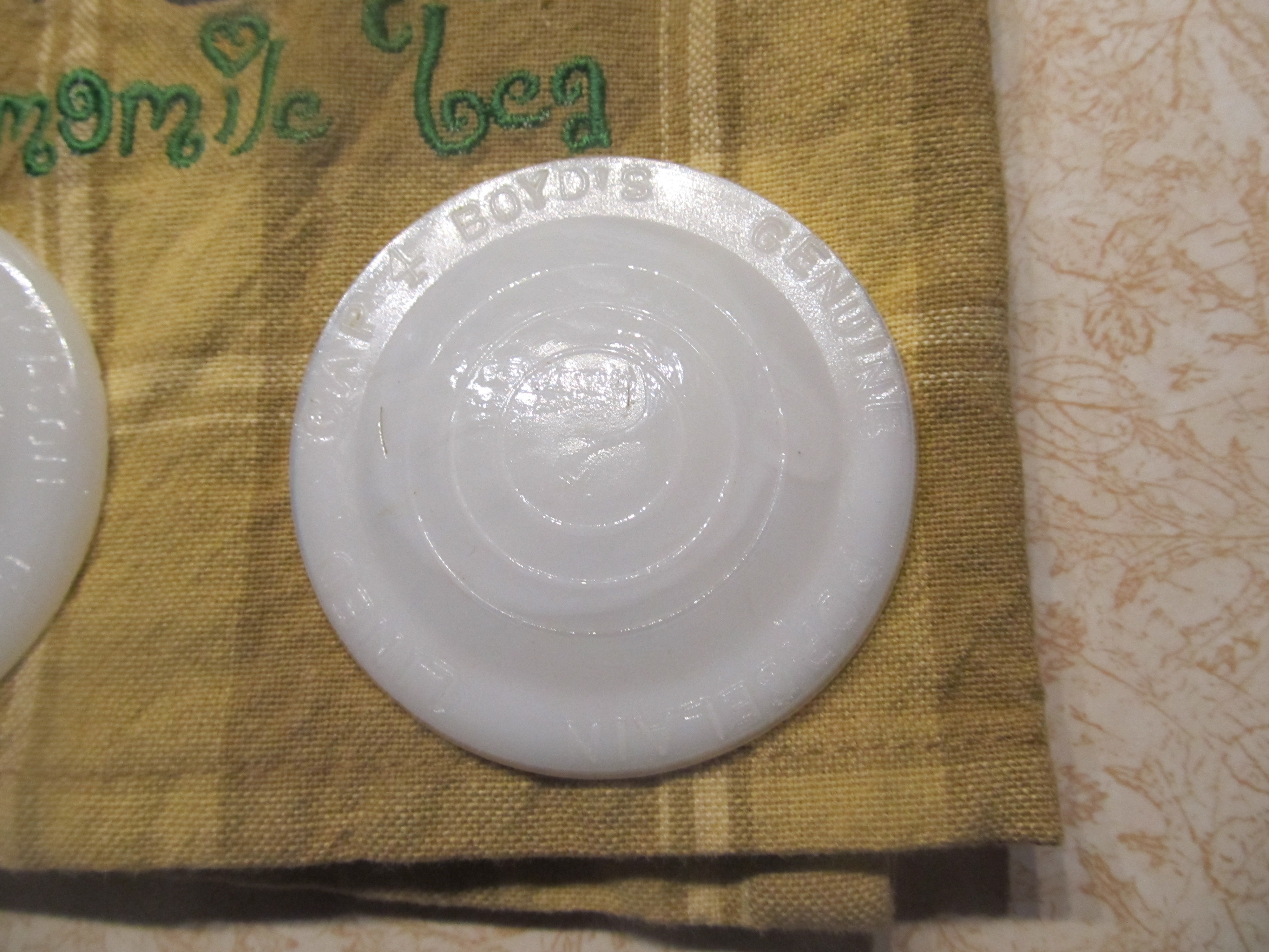 One of the milk-glass lids has concentric circles and the other is plain.  The plain lid is the earlier of the two from what information I have found.  If someone knows more about these items I would love to know!
