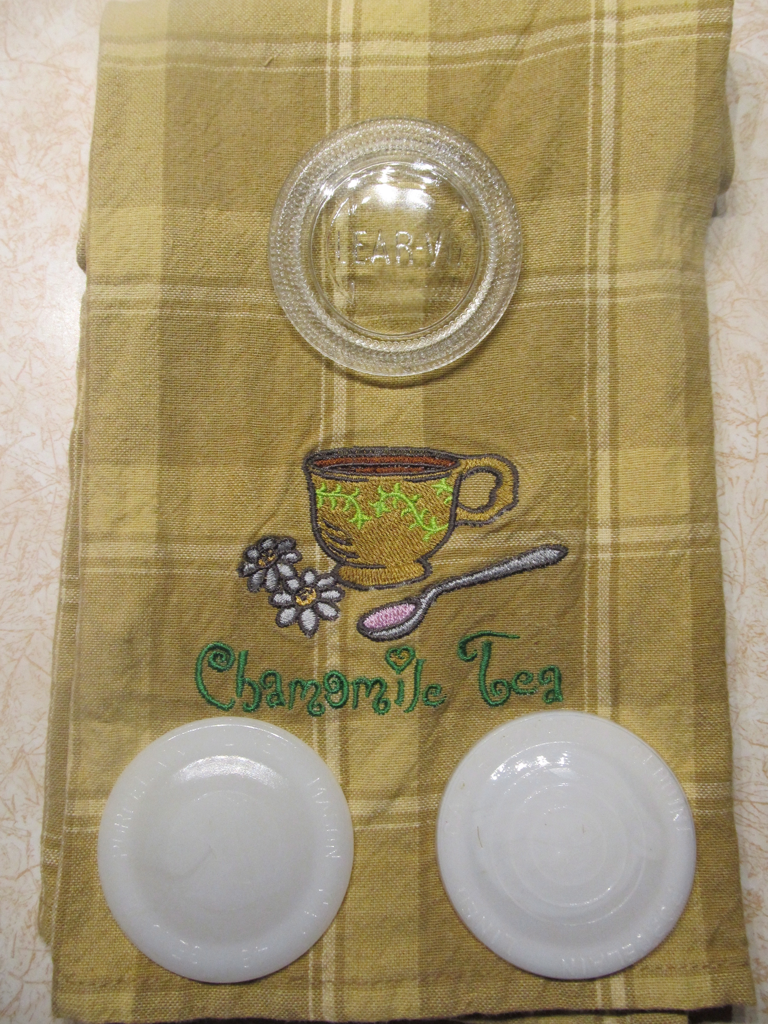Last week my husband found 3 glass mason jar lids.  Two of them are milk glass and one is clear. All are in perfect condition.  Antiques for sure.  Valuable? Only to me, most likely.  I know how they were used in the late 1800’s and early 1900’s, and I am only happy to enlist them into service in 2012.  Glass lids were used to create a barrier between the contents of canning jars and  zinc lids.  Today I use the lids with a metal band to secure  opened jars of  home-canned goods in the refrigerator.