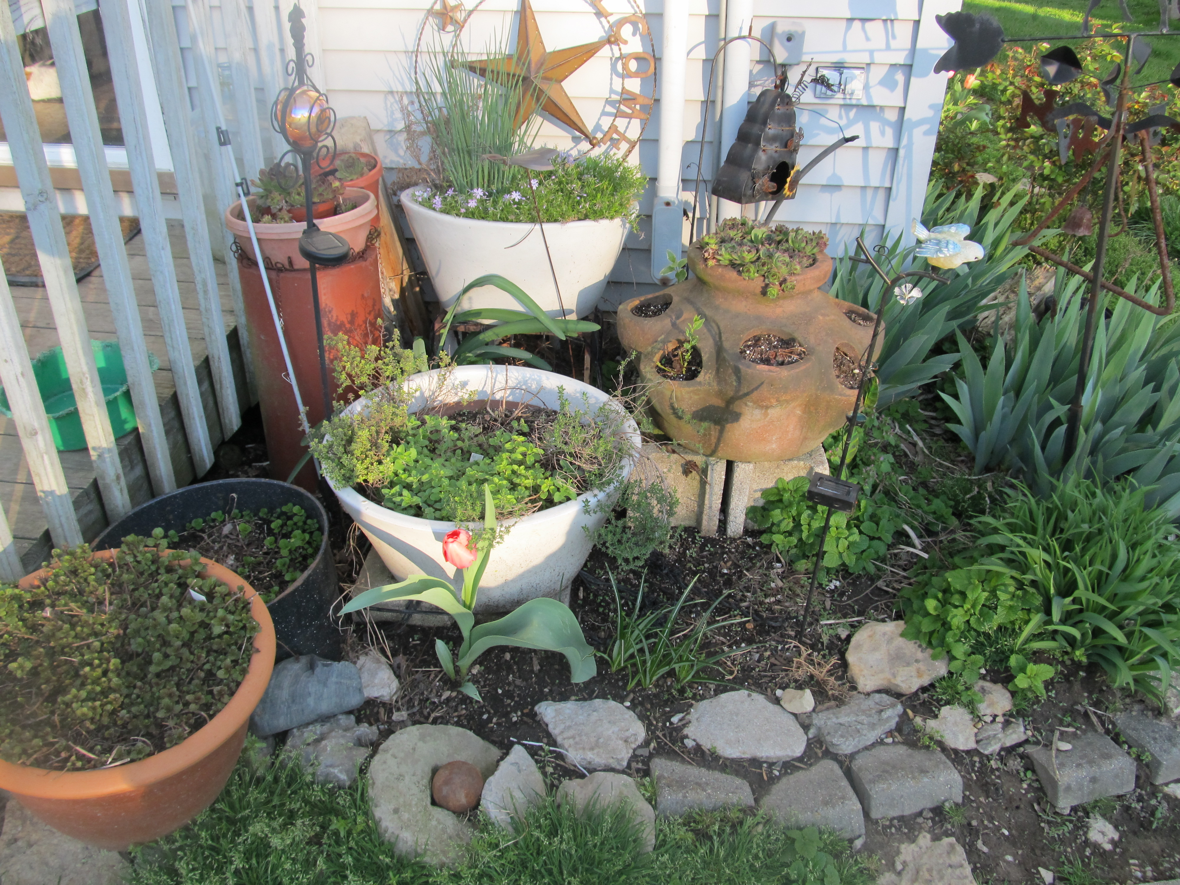 This is my little garden outside the back door. Everything is beginning to sprout new growth: mint, chives, grape hyacinth, thyme, oregano, tulip, day , iris, and lemon verbena. The hens and chicks grew like crazy last fall and wintered over with a beautiful burgandy blush on the tips.