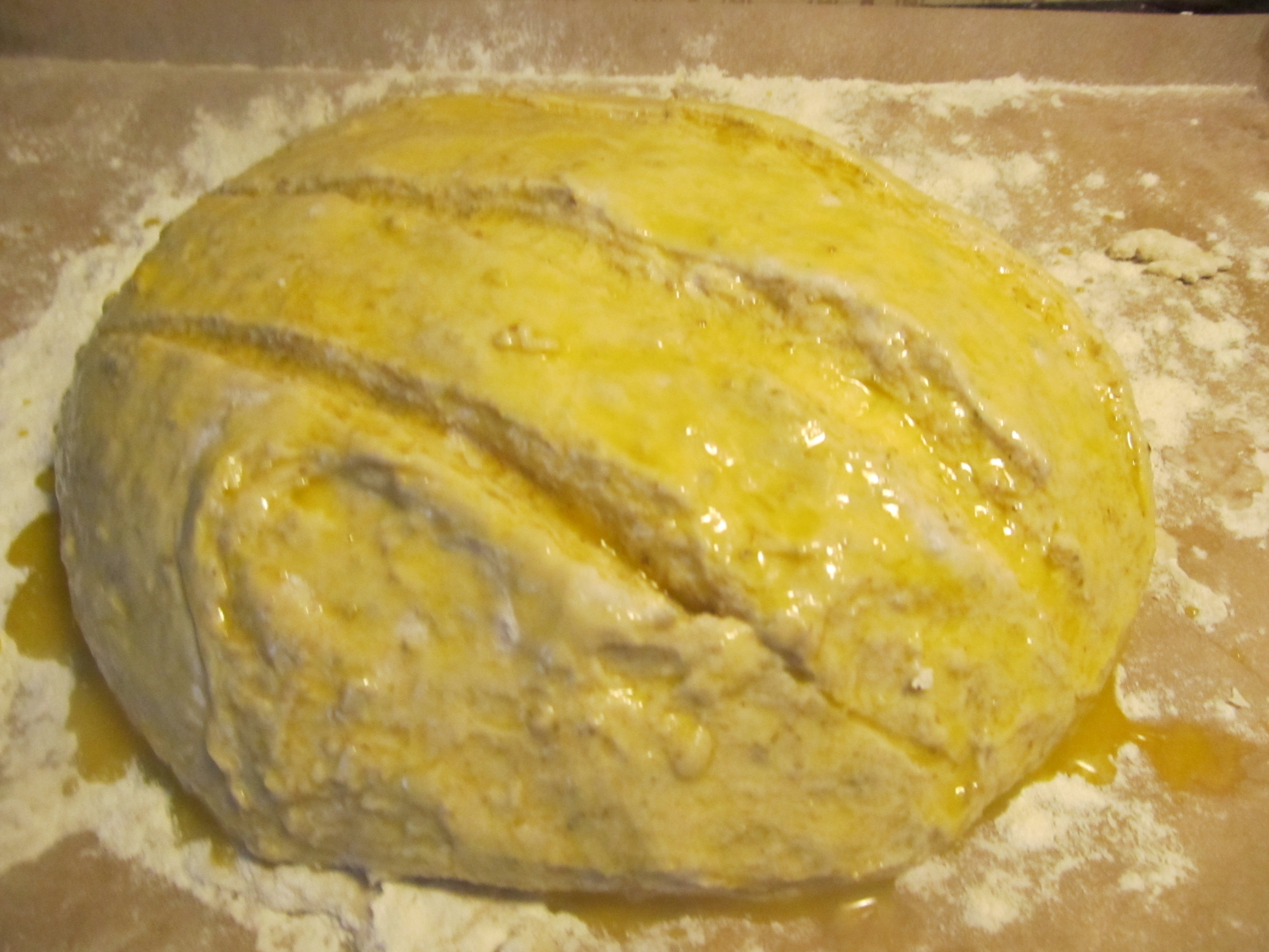 Dough may be used when finished rising or place the bucket with lid in the refrigerator to keep for up to 10 days.  To bake, scoop about 1/4 of the dough out with your hands and sprinkle a bit of flour on top.  Gently pull the sides down and under the loaf adding sprinkles of flour as needed until a smooth surface dough ball is achieved.  Place the dough on a baking sheet with no edge on one side, on top of a piece of parchment paper.  With a serrated knife, cut slits in the top as desired.  Next mix one egg with a bit of water and then brush the egg wash onto the surface of the bread.  This will give a nice brown crusty finish to the loaf.  Let rise for 15 minutes.