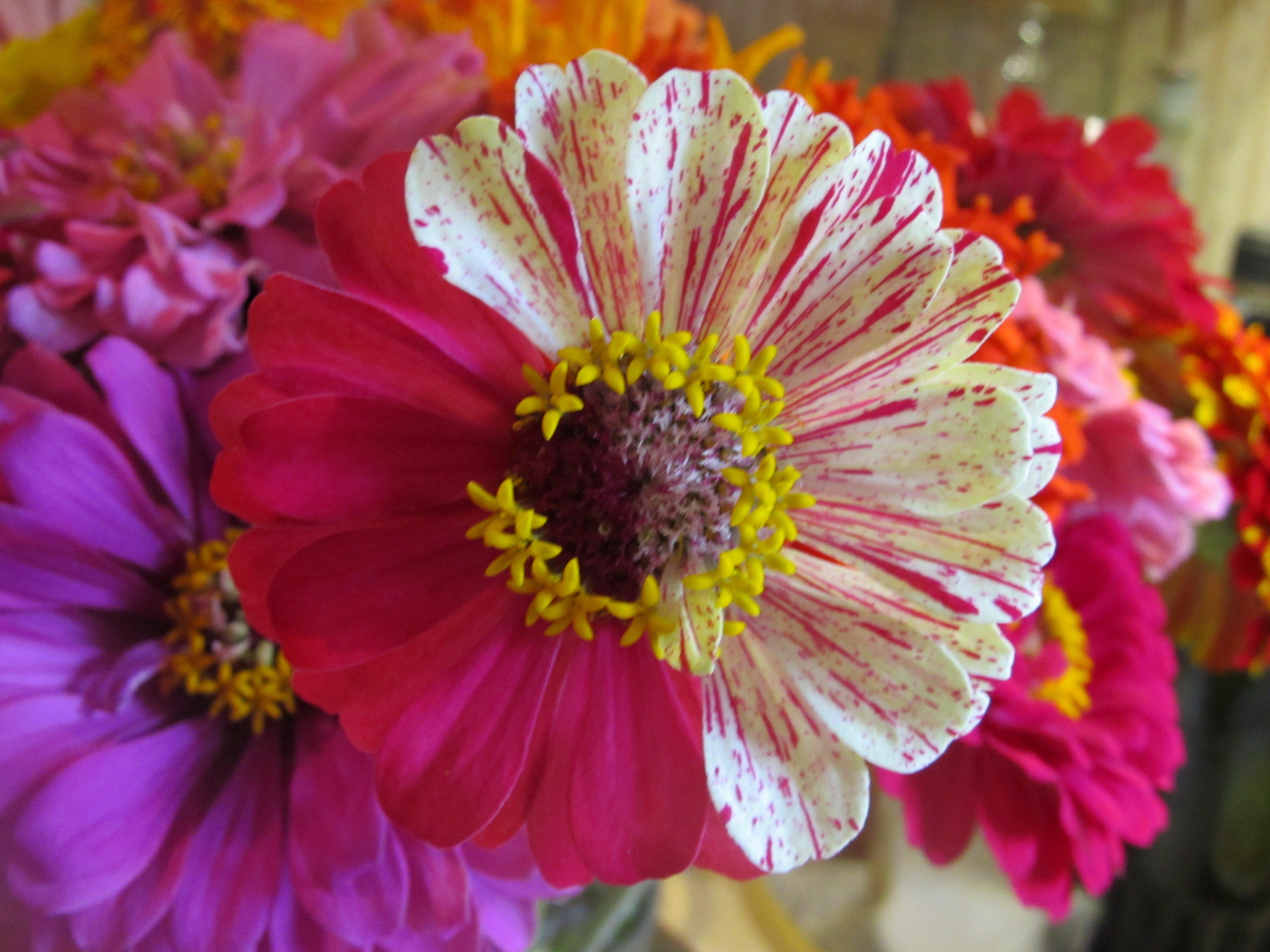 A bouquet fresh from the garden. Zinnias are so colorful and come in a variety of colors and shapes. These are from the Benery Giant collection from Harris Seeds.