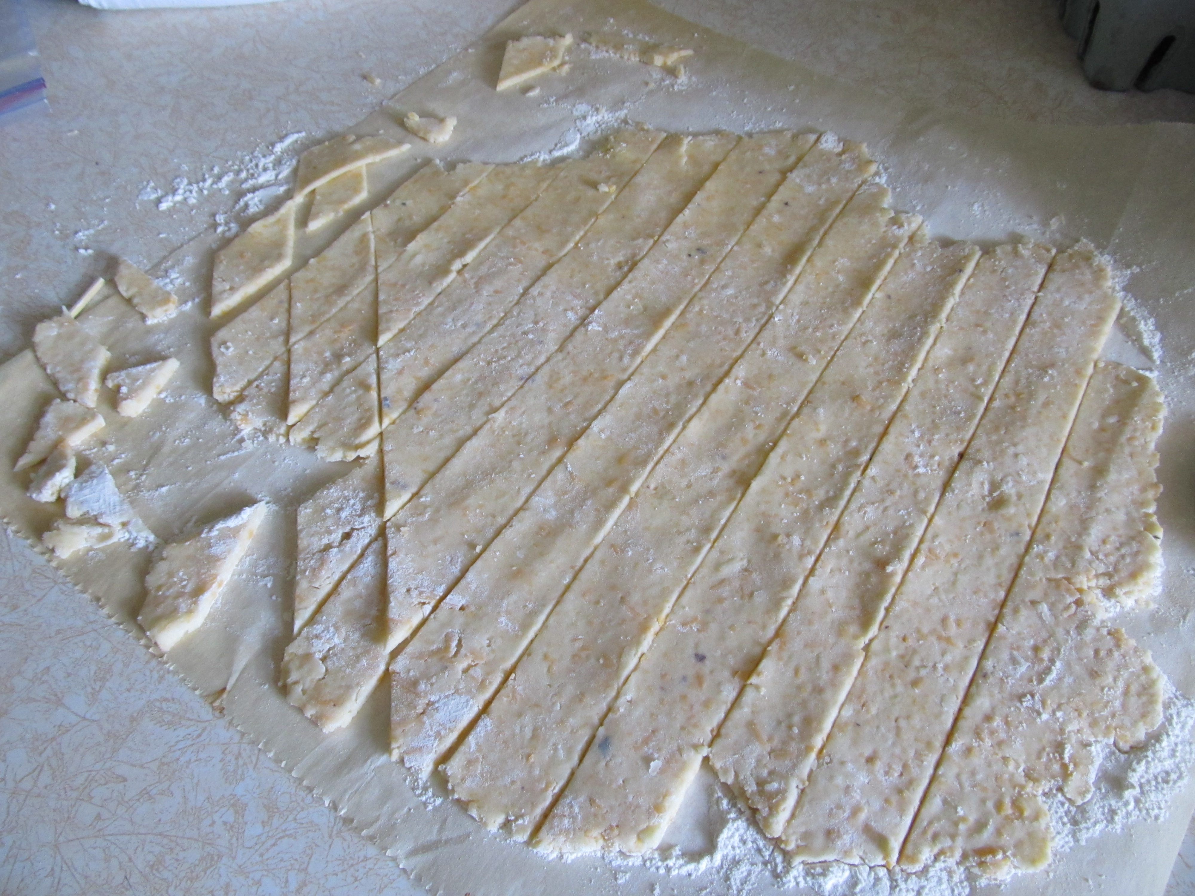 Roll the dough to 1/8th inch and cut into shapes about 1 inch in size. I cut these into diagonals. Note I used parchment paper to roll them out.