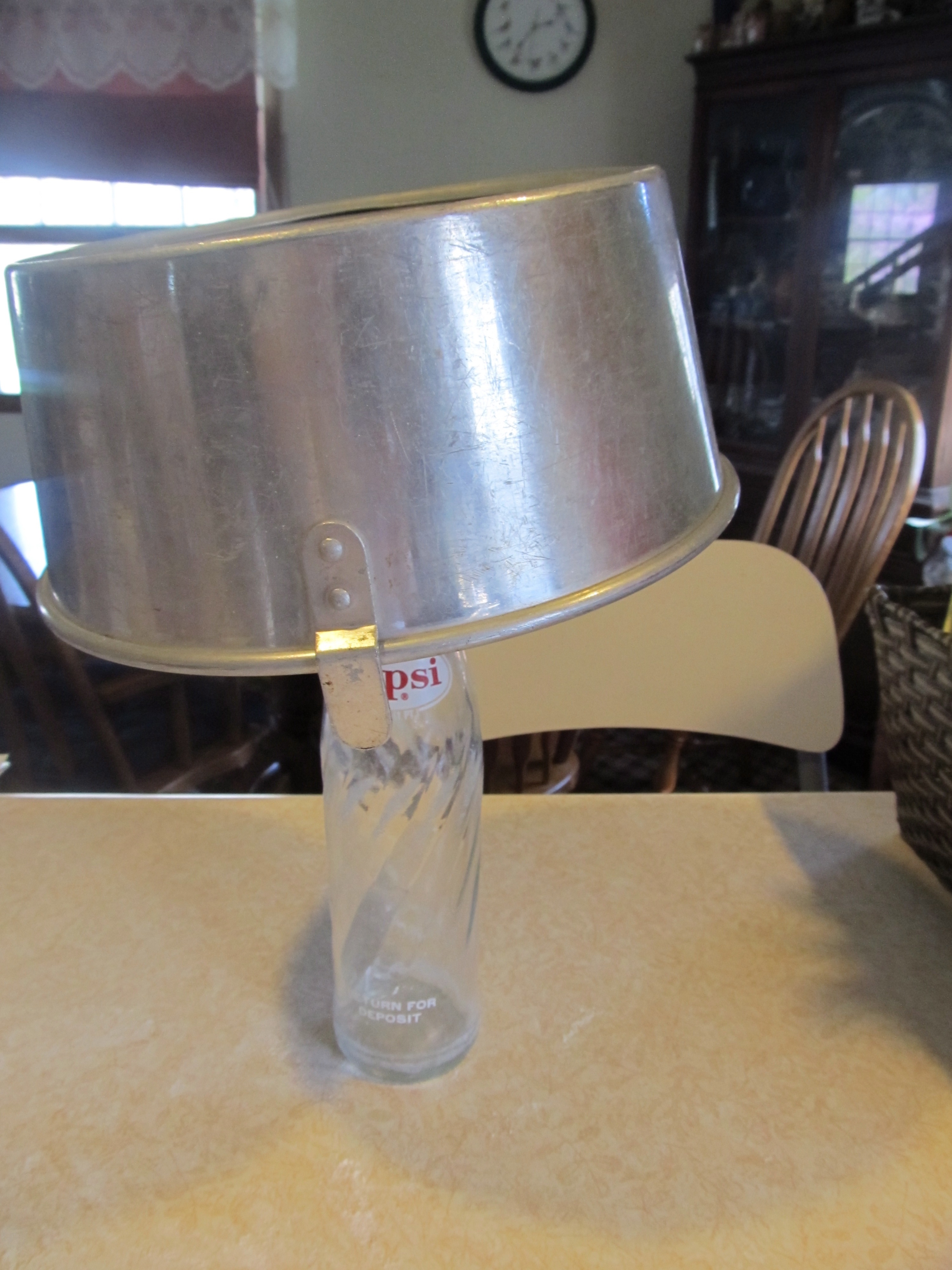 An old glass pop bottle is just the ticket to hang the cake upside down.